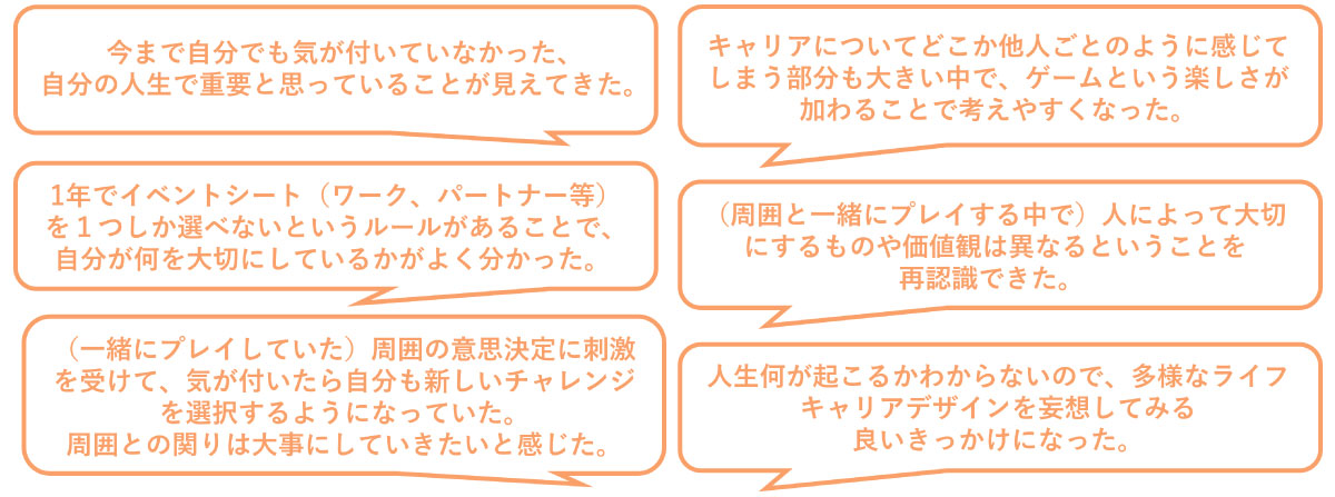 山田:人事の方からいただいたフィードバックでは、「キャリアデザインを後回しに考えがちな若手社員にとっていい機会になった」「その人にとって人生でなにが大事なのか垣間見ることができた」といった声をいただきました。