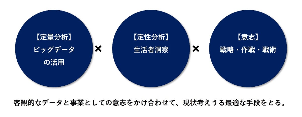 ビッグデータとデータサイエンスでの定量的な分析に定性的な生活者発想・未来洞察をかけ合わせることで事業の成長戦略を描く。