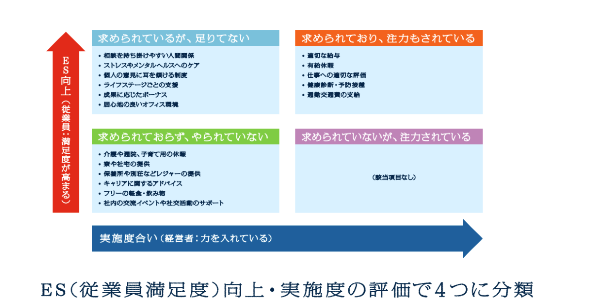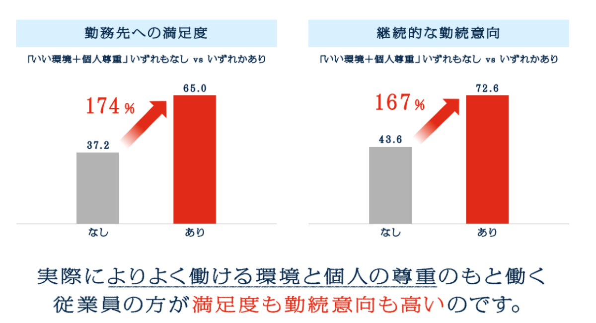 伊藤:右上のエリアにあるのは正当な対価や基本的な福利厚生など、従業員が安心して働けるために必要な環境要因。一方左上にあるのは、「よりよく働ける環境」「個人としての尊重」など、働きがいにつながる意欲的な要因が多く集まっていました。今回の調査でも、よい労働環境と個人の尊重が両立されている人ほど、いまの勤務先への満足度も勤続意向も高いという結果が得られました。
