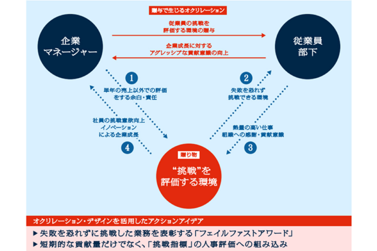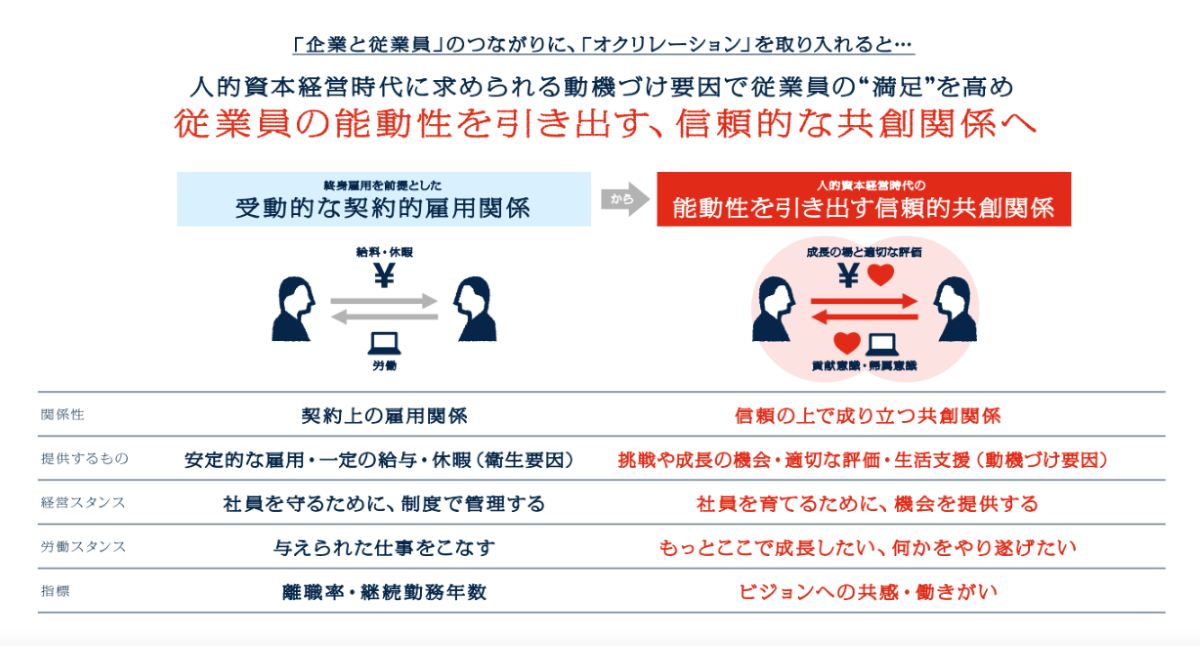 伊藤:適切な給与や有給休暇を与えて、制度で管理しながら社員を守る、というのは終身雇用がベースの背景に基づく契約的な雇用関係ですが、社員も与えられた仕事を給与に見合った分こなすようなスタンスになりがちです。ここにオクリレーションの視点を取り入れると、社員の成し遂げたいことを会社が拾いあげ、挑戦の機会を与えることで能動性を引き出すことができる。信頼のうえで、ともに会社の成長を目指す共創関係が生み出せるのではないでしょうか。