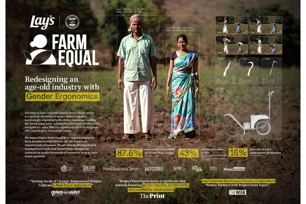 シルバーに選ばれたポテトチップメーカーのレイズの「PROJECT FARM EQUAL」は、女性が率いる農場は男性経営農場に比べて収穫量が30%少ないという事実に着目したプロジェクト。その原因は、農機具が男性サイズでつくられていたことだったんです。農機具を女性のサイズに合わせたところ、大きい芋が穫れるようになり、収入も増えて、女性の地位向上にも繋がった。男性を主たる就業者として規格やルールが決められていることって、日本にも、どこの企業にもあるんじゃないかと思うんです。判断するポジションが男性ばかりだと気づかないことがある。そこに目を向けることが企業の成功につながるという気づきを与えてくれた作品です。