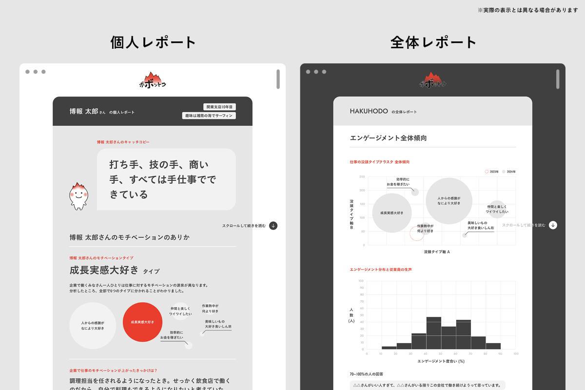 私がこれまで行ってきた数百のインタビュー経験をもとに、導入企業に合わせた形でインタビューフローを作成し、大人数の従業員にデプスインタビューしていく流れになっています。特長的なのは、AIキャラクター「ボボまる」がインタビュアーを務めることですね。人相手や単にシステム上で話すよりも、AIのキャラクターの方が愛着や親しみを持ちやすいですし、従業員からの本音も引き出しやすいと考えたからです。また、インタビューした内容は「個人レポート」、「部署レポート」、「全社レポート」という形で3種類のレポートにすることで、従業員の仕事に対する思いやこだわり、興味・関心などを可視化できるようにしています。