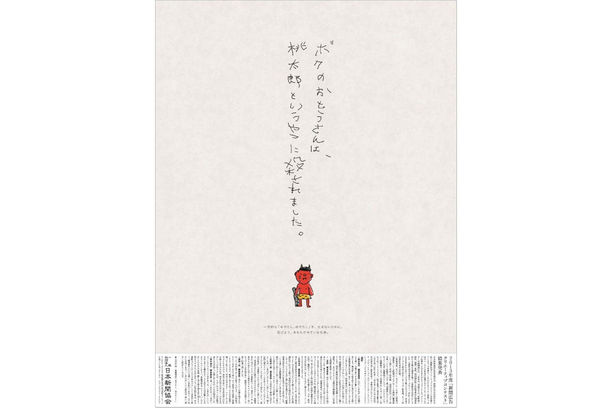 2014年に山﨑、小畑が制作した日本新聞協会の新聞広告「ボクのおとうさんは、桃太郎というやつに殺されました。」から生まれたワークショップ形式の道徳教材。当たり前に使われる「めでたし、めでたし」を異なる立場で考えることで、さまざまな視点を持つことの大切さを伝える授業です。