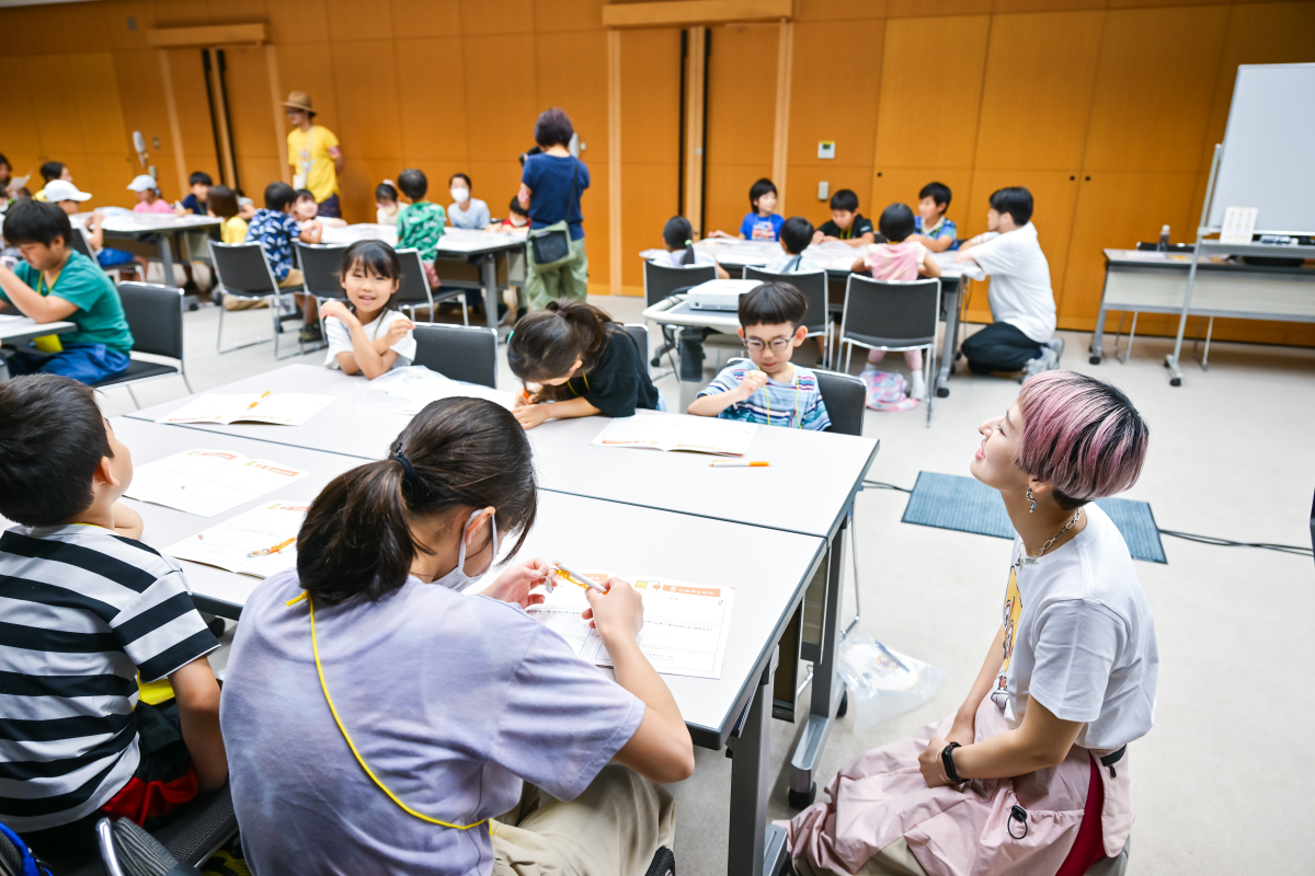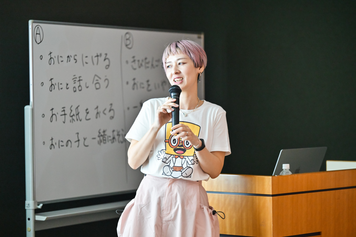 外交官を呼んで第三者視点を入れるという大人顔負けの意見から、動物を触って癒されてもらうというかわいいアイデアまでさまざまな選択肢を考えてくれた子どもたち。さいごに、桃太郎の話の続きを考えようという宿題を出して、ワークショップは終了しました。