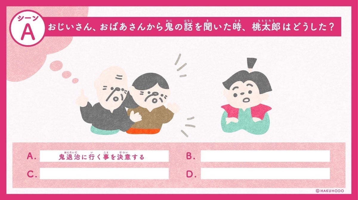 A:「桃太郎がおじいさんおばあさんから鬼の悪さを聞いたシーン」…物語のなかでは鬼退治に行くことを決意しますが、他の選択肢は?