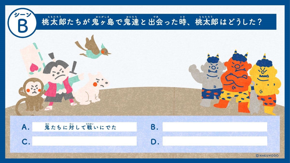 B:「桃太郎が鬼ヶ島で鬼と出会ったシーン」…物語のなかでは戦いましたが、他の選択肢は?