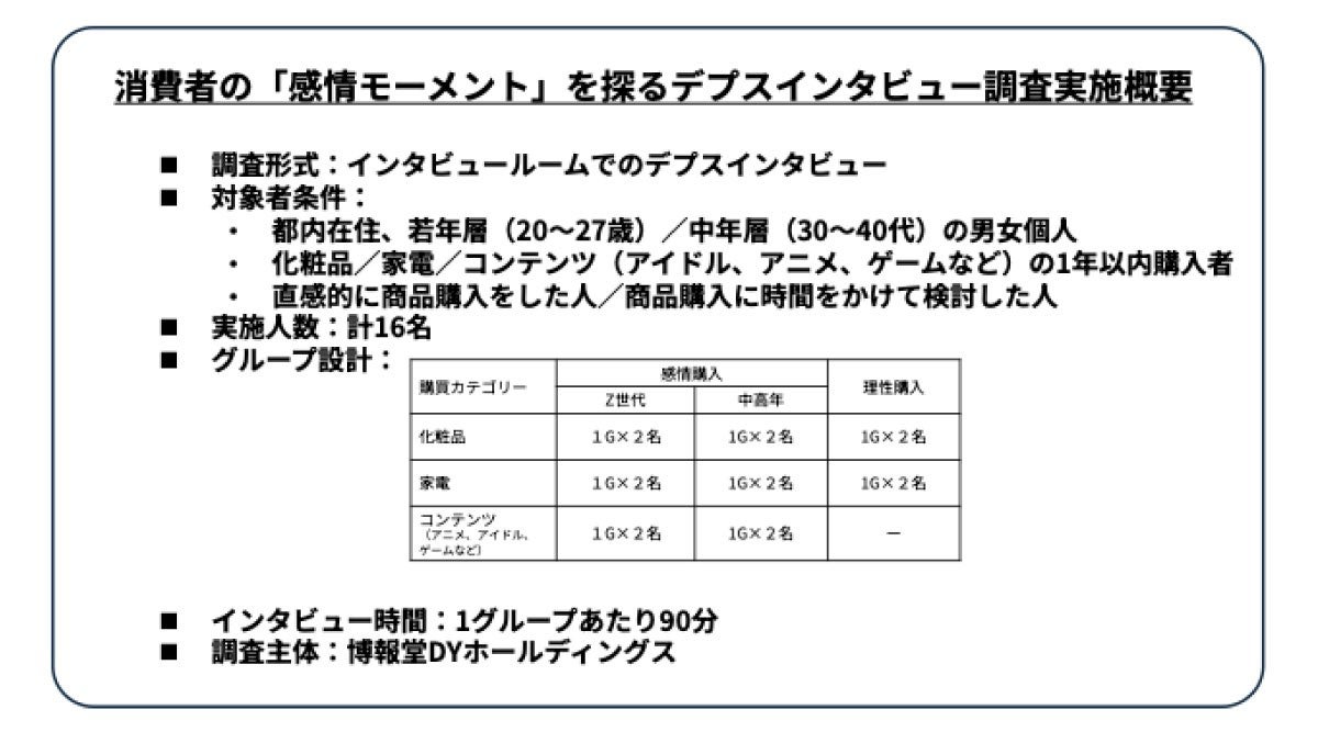 今回はデプスインタビューで出た発言や意見を振り返りながら、議論していければと思います。まず、博報堂DYグループにて行った消費者のデプスインタビューの調査設計を紹介します。情報をもっと知りたくなる、人に伝えたくなる、思わず買いたくなるなど、次の行動につながる感情そのものの変化や変化する瞬間をこのプロジェクトでは、「感情モーメント」と呼ぶことにしました。その「感情モーメント」を探るべく、合計16名にインタビューを実施しました。世代による違いも含めて幅広く意識を捉えるため、男女若年層(20~27歳)および男女中年層(30~40代)、さらに「直感的な購入」と「理性的な購入」という買物の仕方によってグループを分けています。