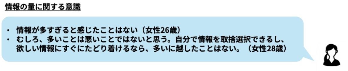 デジタル時代の情報量の多さに困っている生活者も多いのではと思っていましたが、案外困っていない、むしろ情報量の多さをポジティブに捉えている方が多く、印象深かったですね。選択肢が増えるので良い、SNSで自分に合った情報だけを見ているので情報が多いとは思わない、などの意見が象徴的でした。余計な情報はスルーするのが当たり前、といった様子もありましたね。マーケターや研究者からの視点だと、情報量の多さはどうしても目につくのですが・・・(笑)。