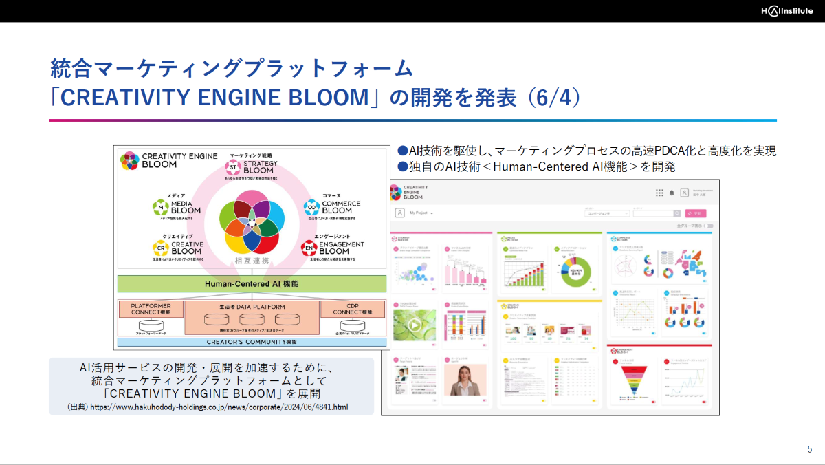 また、先日、AI活用サービスの開発・展開を加速するために、統合マーケティングプラットフォーム「CREATIVITY ENGINE BLOOM」を発表しました。このプラットフォームによって、顧客企業のみなさまによりサービスを届けやすくなるだけでなく、さらなる利便性向上にもつながると考えています。