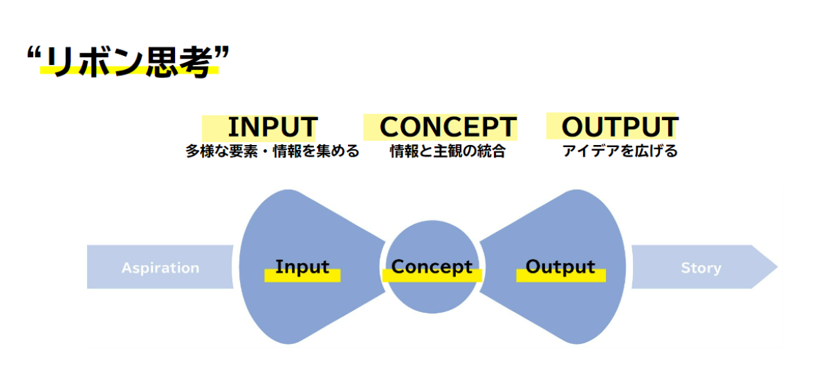 やり方の型は非常にシンプルな「インプット・コンセプト・アウトプット」の3段階です。多様なインプットをコンセプトに集約して、そのコンセプトをアウトプットに広げるというリボンフレームを使用しています。