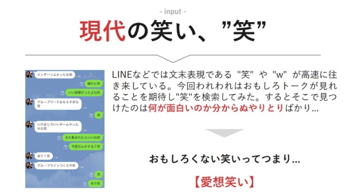 メッセージ内の「(笑)」が増えると社交辞令の多いコミュニケーションとなるということを発見し、それを探知してアラームを通知するという、「笑うことは良いことだ」という前提を疑い、「笑」をアラートにするという逆張り・別解的見方も印象に残っていますね。