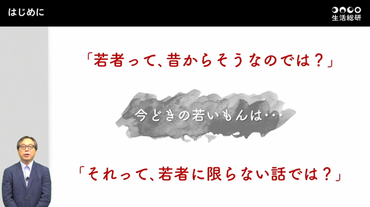 講演の冒頭では、石寺所長より挨拶と、今回のテーマ「若者30年変化」についての導入がありました。