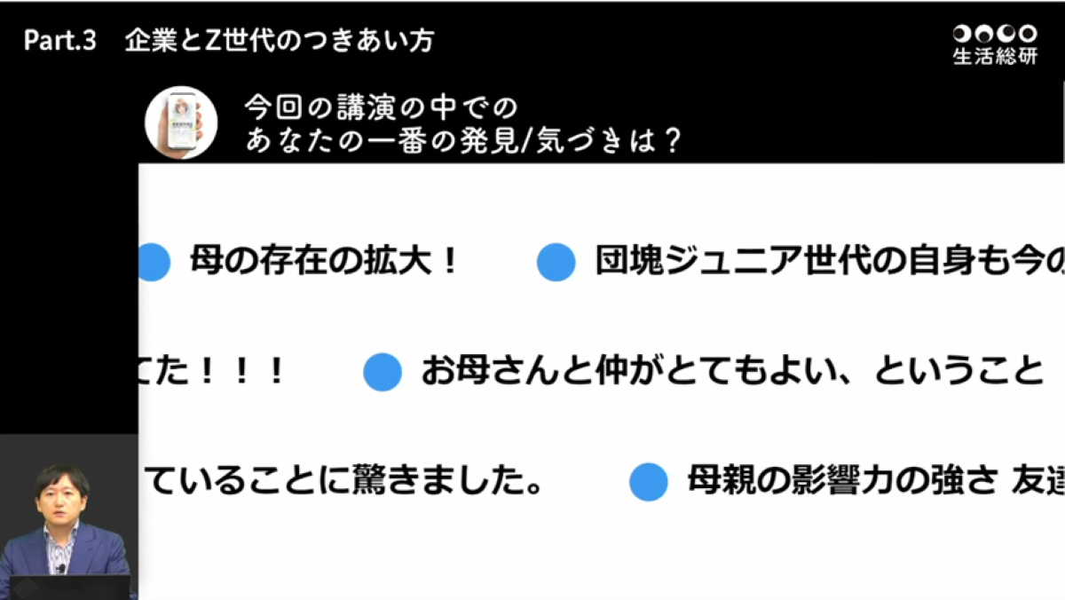 ・Z世代のど真ん中として拝聴しました。まさに自分や周りの友人を見ているようだと感じるほど細かく精度の高い分析でした。