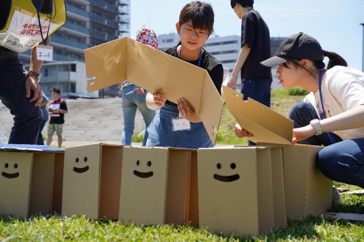 続いては「生活環境整備」パートです。参加企業に提供いただいた段ボールテントや簡易トイレなどを使い、避難先や何か困った状況に陥ったときの、快適な生活環境づくりに挑戦しました。高齢者や体の不自由な方にはどんな工夫が必要か、どうすれば皆が安心して心身共に休める場所がつくれるか。互いの得意を活かしつつ力を合わせ、手元にあるもので何とか工夫する力をつけられるように意識しています。