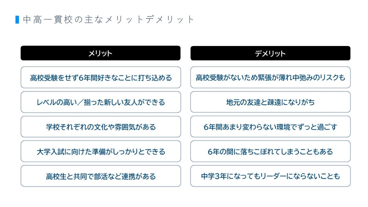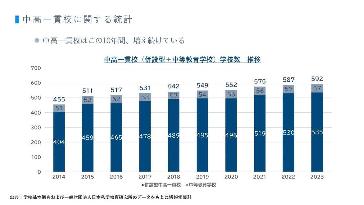 特に首都圏でいうと、やはりニーズが大きいから学校も増加しているのだと思います。高校受験が不要なことをメリットと捉えて、早い時期から将来に向けた教育を望む家庭が増えているのでしょう。保護者には、中学受験の次は大学受験という道筋が描きやすいです。