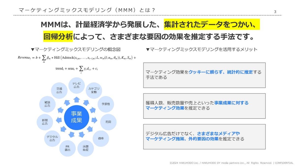 マーケティング・ミックス・モデリング(MMM)は、計量経済学から発展したマーケティング効果計測手法です。回帰分析、すなわち結果となる数値とその要因と考えられる数値の関係を明らかにする分析方法を応用したものがMMです。この手法を活用することで、どのようなマーケティング施策がどのような成果につながったかを高い精度で推定することが可能になります。