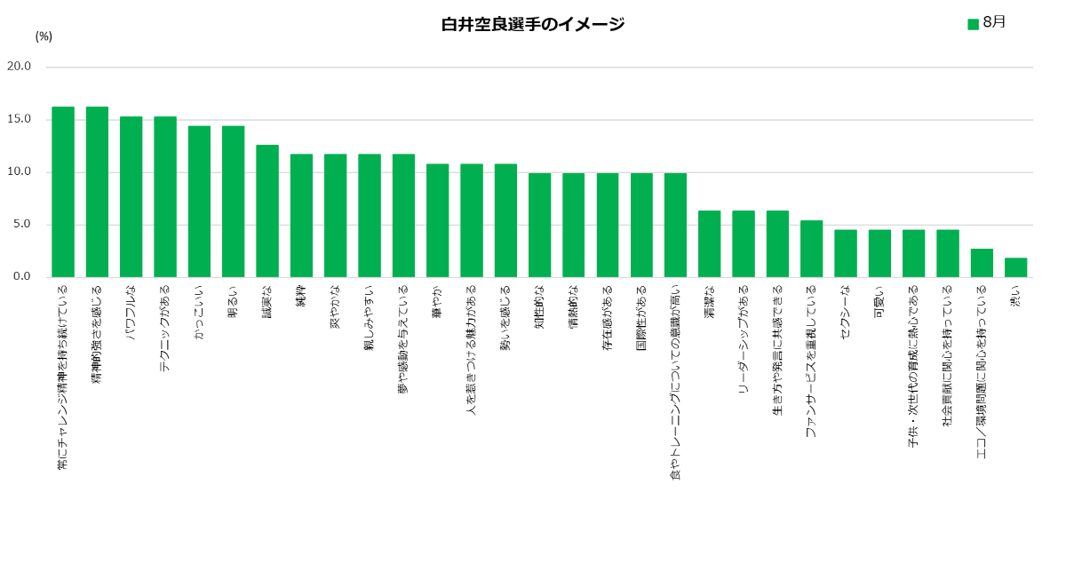 -博報堂DYメディアパートナーズでは「アスリートイメージ評価調査」という調査を行っているのですが、白井選手は「常にチャレンジ精神を持ち続けている」が高いですね。やはり、難易度の高い技にチャレンジする姿勢が伝わっているんですね。「精神的強さを感じる」も高いです。