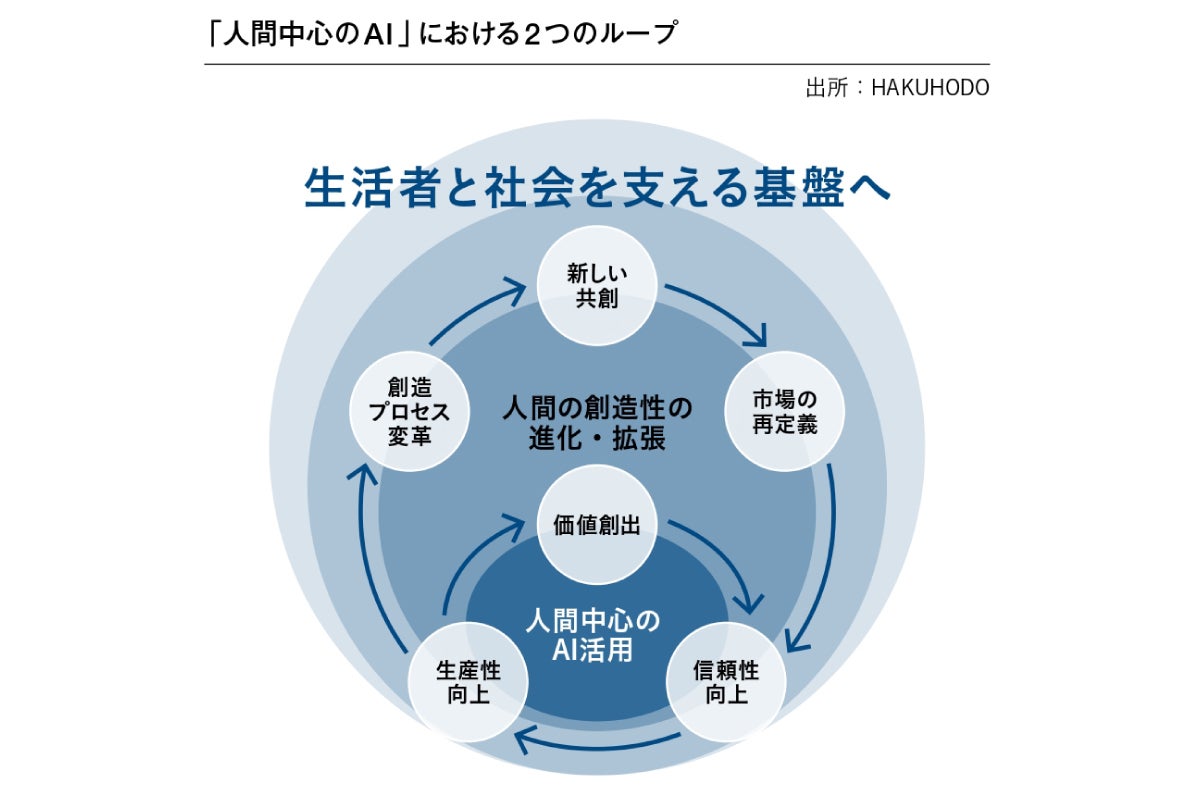 「人間中心のAIは、『人間中心のAI活用』と『人間の創造性の進化と拡張』を軸に2重のループで表すことができます。根幹となるのは『人間中心のAI活用』。AIの信頼性を高め、生産性を向上し、価値を創出すること。我々はその先にあるふたつ目のループを実現していきたい。AIという基盤の上で新しい創造のプロセスを模索し、生活者を含む多様なステークホルダーとの今までにないコラボレーションを生み出していく。そのループが市場の再定義へとつながり、『人間の創造性の進化と拡張』を高めていくことになる。その先には生活者と社会がより豊かになる未来が待っています。そのための“別解”を、AIとともに導き出していきたい」