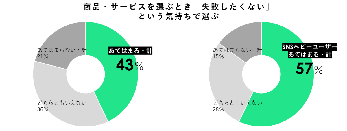 更に、「買物で失敗することが増えていることから、失敗したくない意識が高まっている」という仮説については、デプスインタビューでも「失敗したくない」という声が多く聞かれていましたが、定量調査でも40%超と高い数値で表れていました。