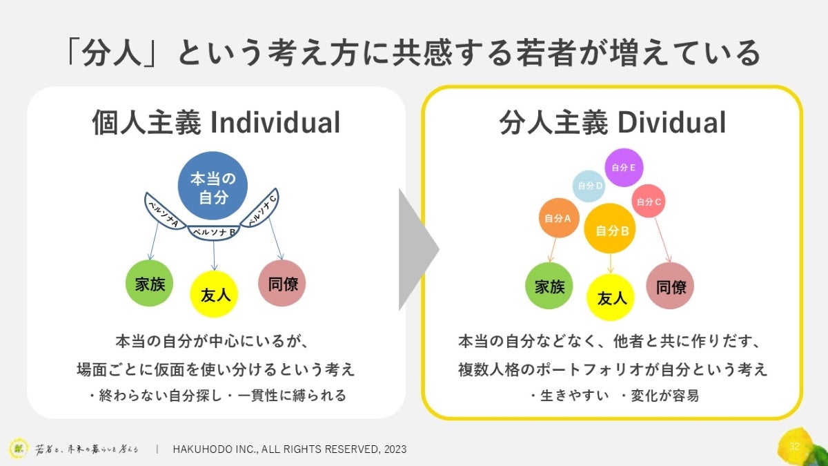 メタバースに限らず、若者がどういうコミュニティにいるかで自分のキャラクターが変わるというのは、「分人」という言葉でも表現されますよね。どちらかが本音でどちらかが建前というシンプルな話ではなくて、自分の中にある複数の自分をポートフォリオのように使い分けているわけです。多様な自分はそれぞれ緩やかにつながっていて、いろんな人といろんな関り方ができる。メタバースではそんな有機的な多様性が実現できるような気がします。