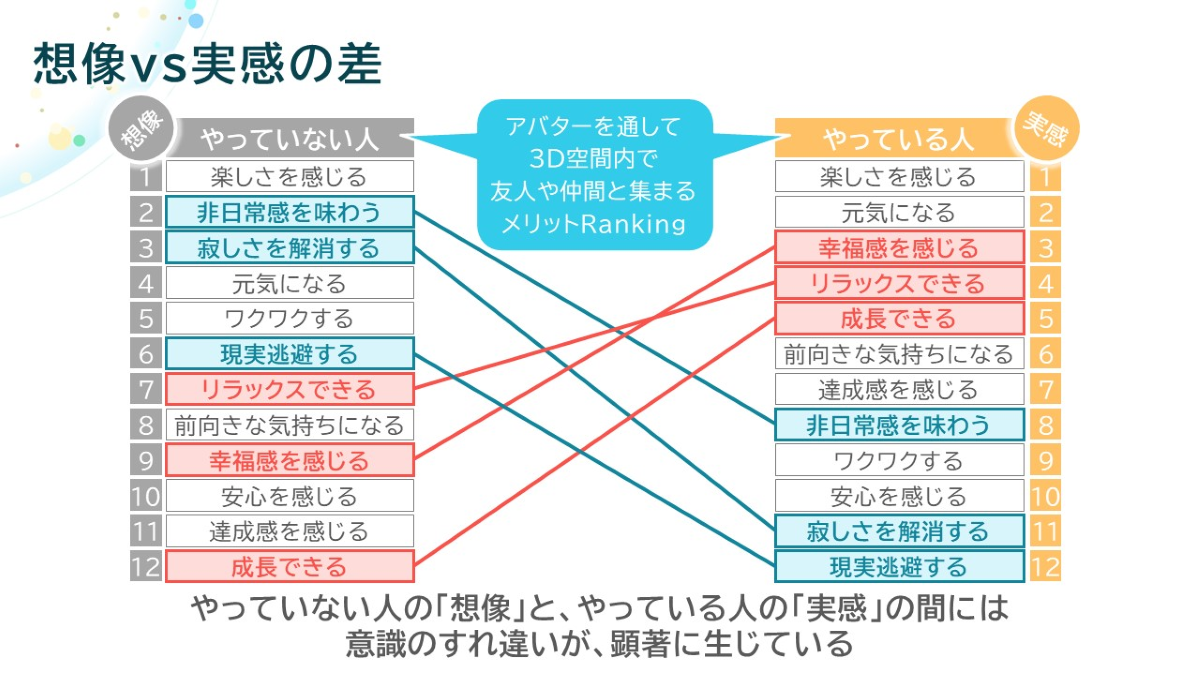 リアルの自分とデジタルの自分がまったく異なる価値観を持つということは、当事者には当たり前のことですが、あまり理解されていないという現状があります。調査データを見ても、バーチャル体験をしていない人たちはバーチャルでの活動を「現実逃避をする」「寂しさを解消する」などのネガティブなイメージでとらえる人が多く、逆に当事者側は、「幸福感を感じる」「リラックスできる」「成長できる」といったポジティブなイメージが強い。両者が本当にきれいにクロスするんです。