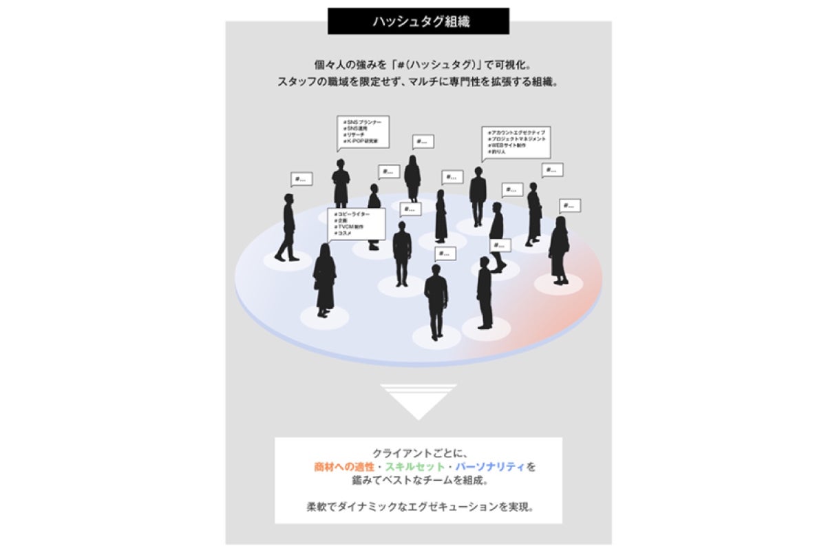 所属云々ではなく、自分の能力がチームそしてクライアントに貢献することが実力であり、実力が伸びると権限が委譲される。それを担保するのがハッシュタグ組織で、皆のモチベーション向上にもつながっています。