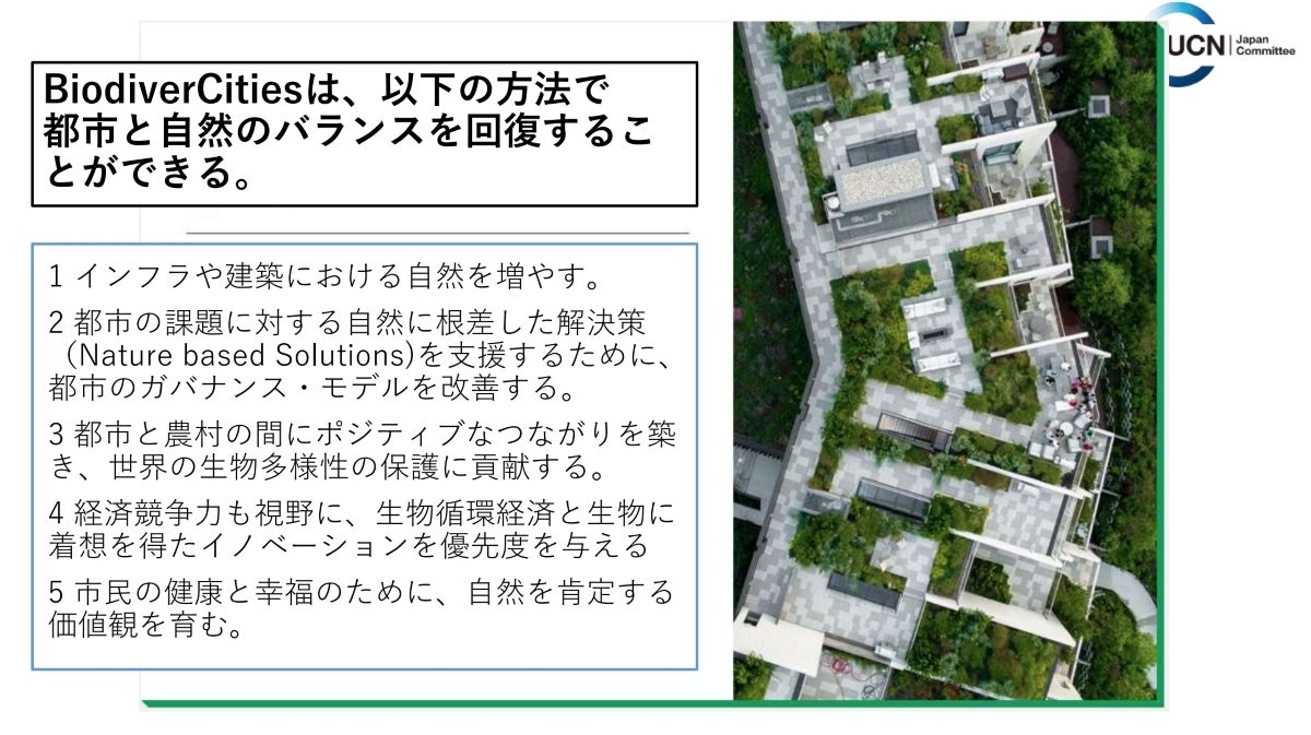 それを受け、ネイチャーネガティブをゼロではなくポジティブにする、「ネイチャーポジティブ」というキーワードが国際会議において注目され始め、同時に、これからの社会は、持続可能なインフラを持つ都市「BiodiverCities」にしていくべきと語られるようになりました。