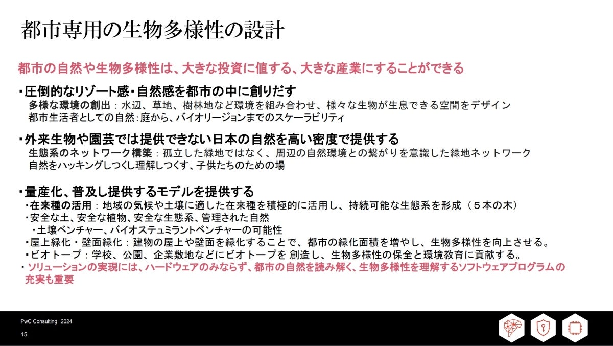 そんな都市において生物多様性の実現に必要なのは、綿密なデザインです。意図的に実現すべきこととして生物多様性を考えなければなりません。つまり、投資や価値観にフォーカスし、これらをマーケティングしていく視点です。
