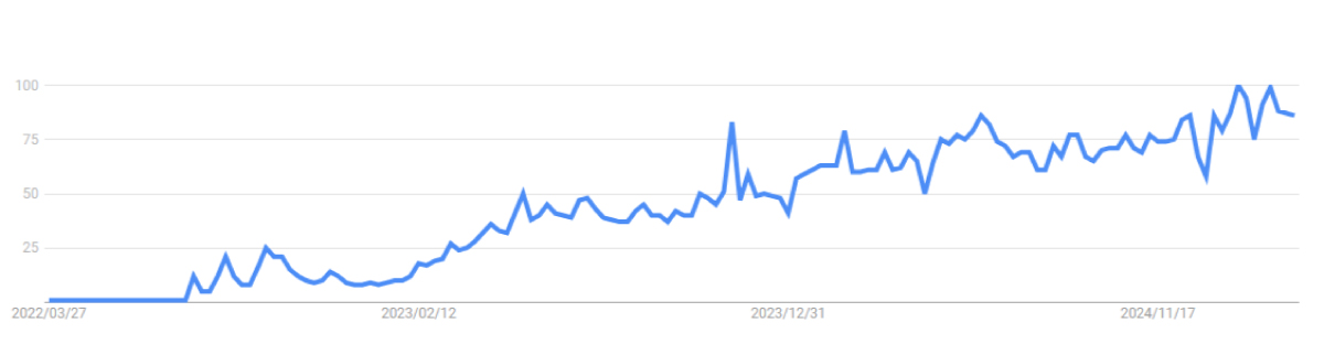 下図の検索推移を見ても分かるように、2023年に進化した生成AIは一気に注目され、2024年も注目は右肩上がり。現在ではもはや生成AIは当たり前の存在になったようにも思われます。
