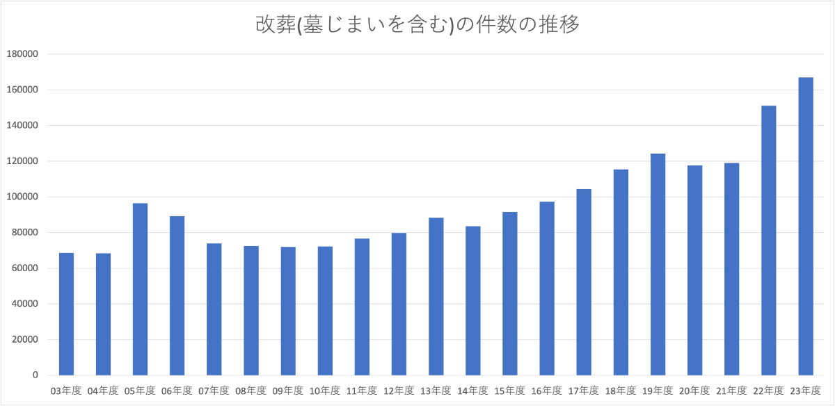 近年では、散骨や樹木葬など家族のお墓を持たない選択をする人も増えました。子に負担をかけたくない、遠方にあり墓参りが難しい、夫婦それぞれの実家のお墓を守るのが大変などの事情から、今あるお墓をたたんで別の場所に移す「改葬」をしたり、先祖代々のお墓を供養しておしまいにする「墓じまい」を選択する人も増えています。