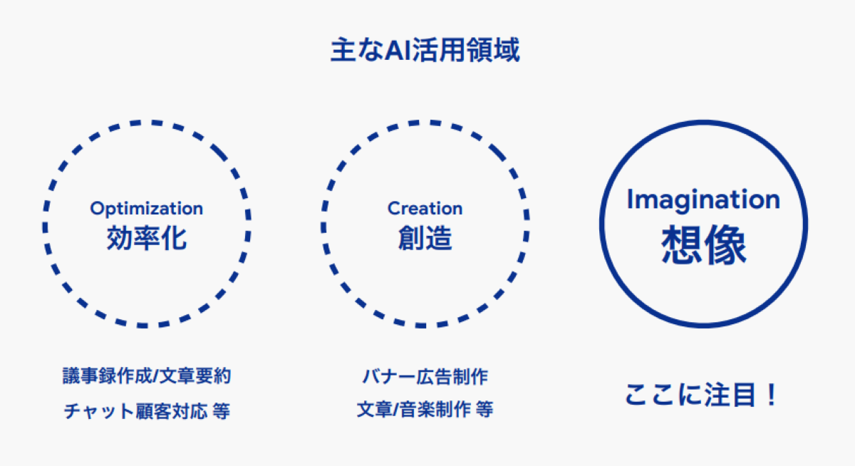 生成AIにはさまざまな活用方法があり、業務の効率化やクリエイティブ制作の支援なども重要な活用分野ですが、私たちのチームでは 「イマジネーションの可能性を広げること」 に特化し、そこに重点を置いて取り組んでいます。