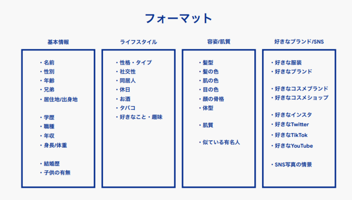 例えばコンビニコスメの商品開発担当者が、普段あまり接点のない20代の若者向けにコスメをプロデュースしたいと考える場合、プロンプトにどのような項目を設定するかが非常に重要になります。私たちは、限られた情報の中でその人の個性がよくまとまっているマッチングアプリのプロフィール項目を参考に、独自の視点を加えてインタビュー対象となるバーチャル生活者の情報を整理するためのフレームワークを構築しました。