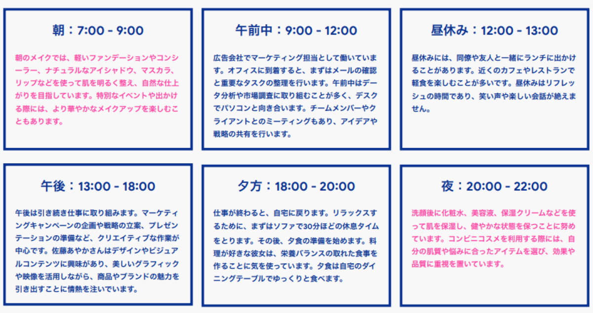 視点を少し変えて、今度は 「佐藤さんが昨日の24時間をどのように過ごしていたのか」 をシミュレーションしてみます。何時にどこで誰と過ごし、どんな気持ちになっていたのか。その中でコスメがどのように関わり、佐藤さんの気分を高めたのかといった一日の細かい流れを追い、カスタマージャーニーを可視化していきます。このデータはまずテキストとして出力されますが、そのままだと情報量が多く見づらいため、朝・午前・昼休み・午後・夕方・夜といった時間帯ごとに分類します。こうすることで、佐藤さんがどこで、誰と会い、どんな気持ちになったのか。コスメがどのように介在し、気分がどのように変化したのかといった詳細なインサイトを得ることができるのです。