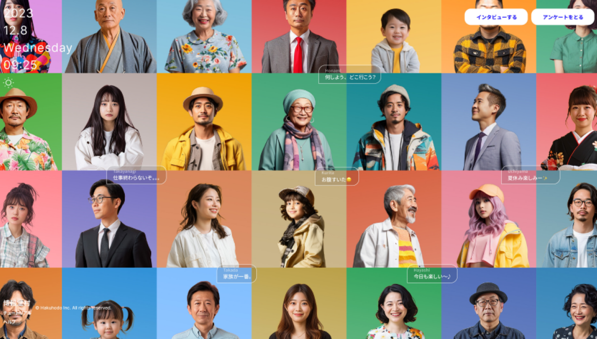 生成AIを積極的に活用する博報堂が2024年3月に発表した生成AIソリューション「バーチャル生活者」。単なるデータ分析に留まらず、生活者の本音や潜在的なニーズを深く理解するためのツールで、マーケティング戦略の立案、新たな事業やサービスの創出、さらにはリサーチの効率化などの活用を想定しています。