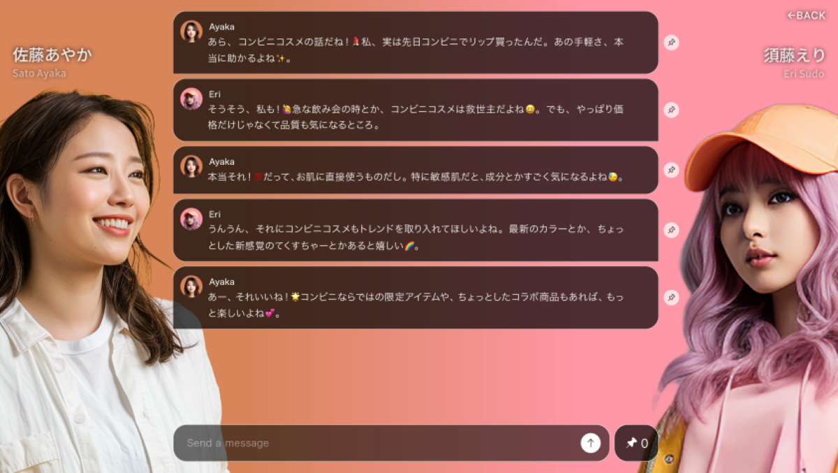 加えて、バーチャル生活者同士の自然な会話を観察できる機能も搭載しています。カフェでカジュアルに会話している様子や普段の日常生活で雑談している風景などを再現し、その対話をユーザーが介入せずに“覗く”ことができる仕様になっているのが特徴です。