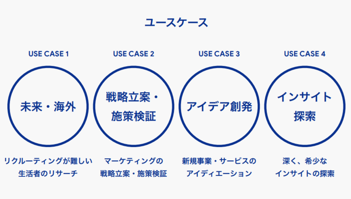 1つ目は、未来の人や海外の人を作るというケースです。例えば、2035年の生活者を想定して新しいニーズを探るなど、未来の消費者や海外の生活者をバーチャルで再現する使い方が有用的だと考えています。