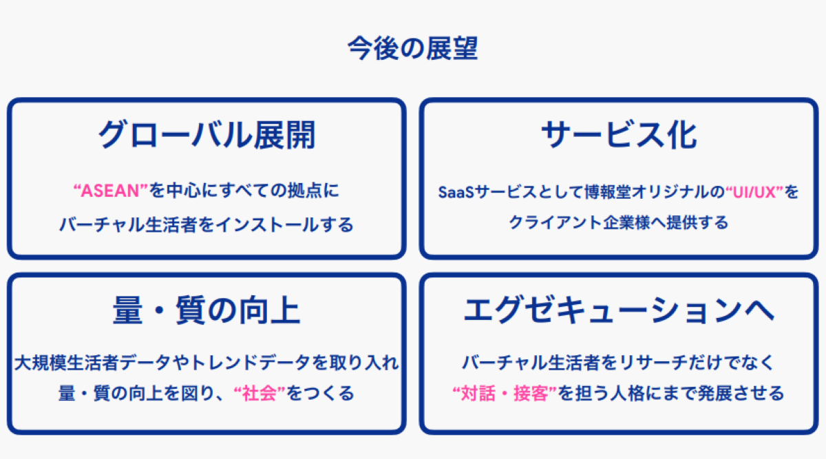 すでにいくつか海外での活用事例はありますが、今後はASEAN地域を中心に本格的な展開をしていくために、より多様なバーチャル生活者を生み出し、各国・各市場に合わせたインサイトを提供できる環境を整えていきます。