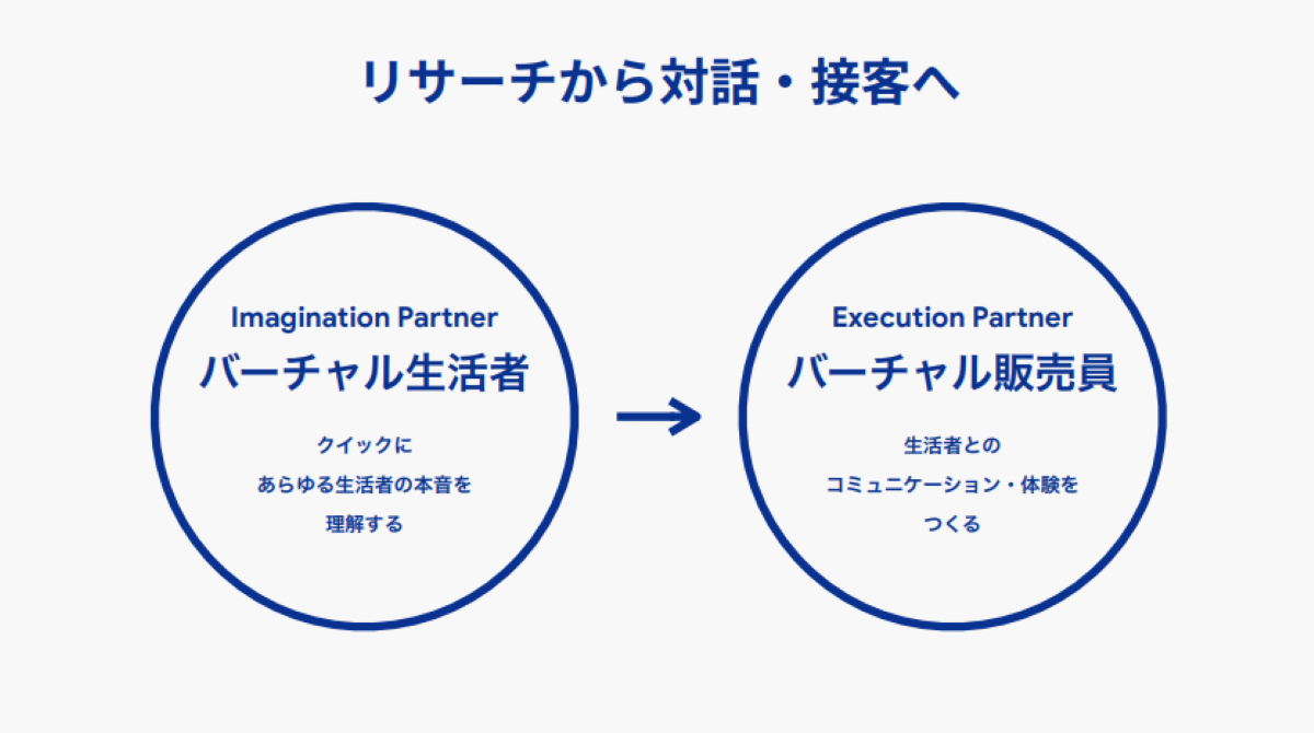 そして、これまでお伝えしてきたバーチャル生活者は、主にリサーチのために活用する人格モデルでした。しかし、今後はその枠を超えて、企業の顧客対応や接客シーンにも展開していきます。つまり、「バーチャル生活者」から「バーチャル販売員」へと進化させ、企業の対話や接客体験の向上に貢献するソリューションとして活用していきます。