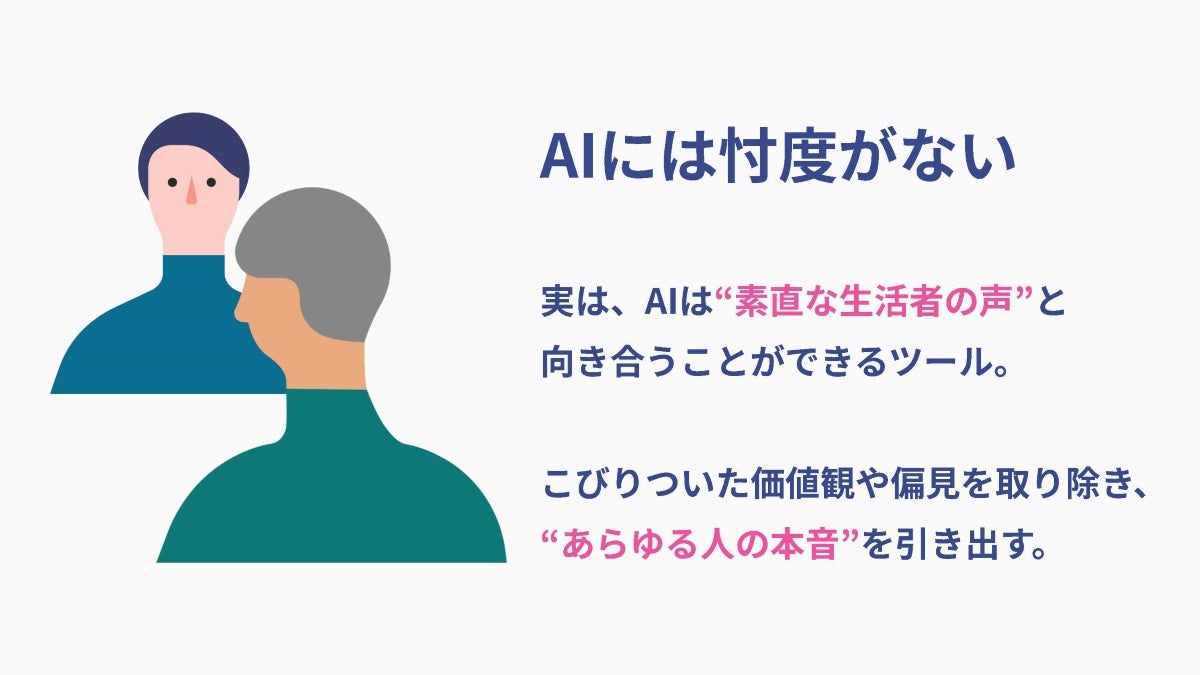 人と人との対話では、立場や関係性によって忖度が生じたり、本音が引き出しにくかったりすることがあります。しかし、生成AIを活用すれば、適切なプロンプトを設計することで、忖度のないフラットな視点から生活者の本音を引き出すことが可能になります。