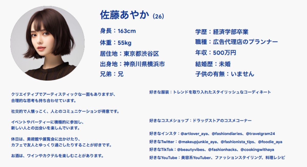 このフレームワークに沿って 「インタビュー対象者のペルソナを作ってください」 と依頼すると、居住地や職業、年収などのデモグラフィック情報、パーソナリティや価値観、SNSの傾向といった詳細なプロフィールのテキスト情報が生成されます。ペルソナシートの“佐藤あやかさん”の見た目は、先ほどのテキスト情報や内面の特徴をもとに、 生成AIを用いてその人物のビジュアルを再現するプロセスを実施しています。