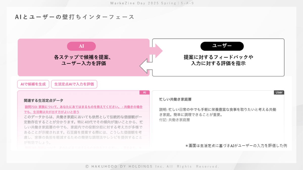 「AIが壁打ち相手となり、マーケターのアイデアを引き出す仕組みを導入しています。各ステップでAIが様々な視点から提案を行い、マーケターがAIに提案された候補を修正していくことで、より創造的なコンセプトを導き出すことができます」(竹村)