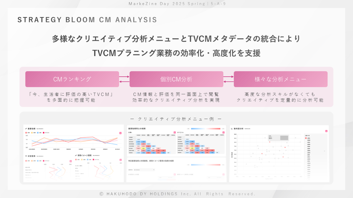 ブランド広告の効果を定量的に分析し、クリエイティブの最適化を支援するのが「STRATEGY BLOOM CM ANALYSIS」だ。これまで、テレビCMなどのブランド広告は効果測定が難しく、広告施策の成功要因が明確になりにくいという課題があった。この課題を解決するために、CREATIVITY ENGINE BLOOMでは35万件以上のテレビCMデータを活用した分析ができる。
