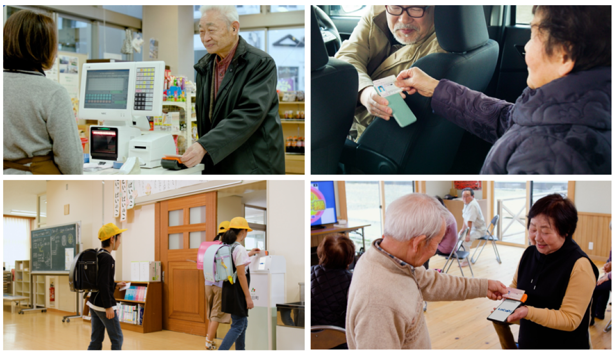 例えば、朝日町が運営する図書館や体育館などの施設に行って、設置されている端末にカードをタッチするとポイントがたまる。同じように民間施設であってもポイント端末を設置していただくことで、同じプログラムに参加できます。見守りサービスでは、子どもが小中学校の登下校時に「こども専用カード」をタッチすると、保護者にメールで知らされる。あるいは、高齢者がイベントなどに参加した際に自身のマイナンバーカードを専用端末にタッチすると、遠隔地に住んでいる家族にその旨が通知される。これらの機能を、マイカー公共交通サービス「ノッカル」や、地域教育サービス「みんまなび」といった、朝日町とともにこれまで展開してきたサービスと連携させ、生活の様々な局面で活用できるようにしました。