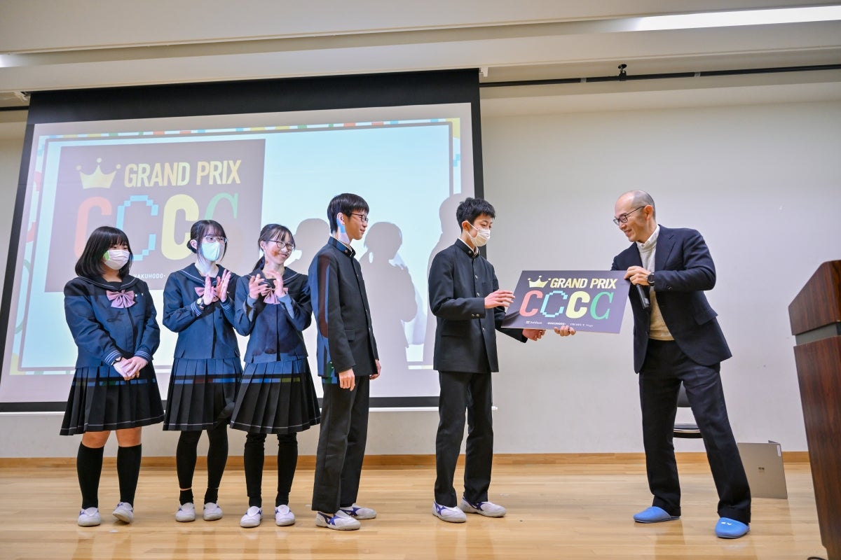 全25チームのプレゼンが終了し、審査員による厳正な審査を経て、いよいよ結果発表です。ゴールド賞1チーム、シルバー賞2チーム、ブロンズ賞3チームを選定、さらに生徒たちの投票1位のチームにも「生徒賞」が贈られました。見事ゴールド賞に輝いたチームには、審査員からは「一歩抜け出ていた。課題設定も内容も現実味があり、画面を作って見せてくれた点もイメージを想起させるもの。我々にとっても現実にできそうだと思えた。たった3分間でも人の心を動かせることを証明してくれた」と講評がありました。