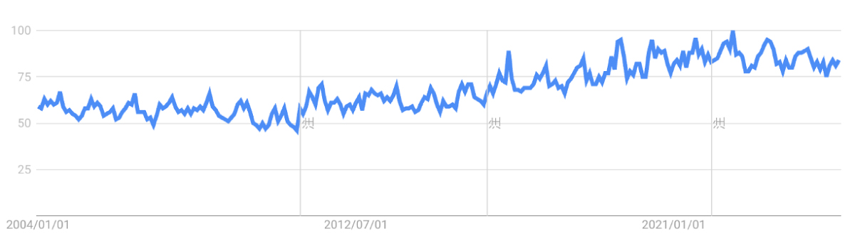 そこで、Googleトレンドで「ペット」を検索してみると、近年、検索ボリュームが右肩上がりに徐々に伸びており、コロナ禍以降も高水準を維持していることがわかります。