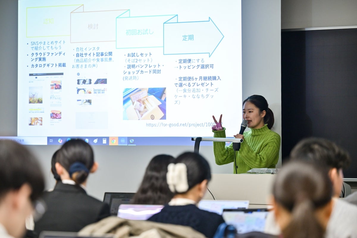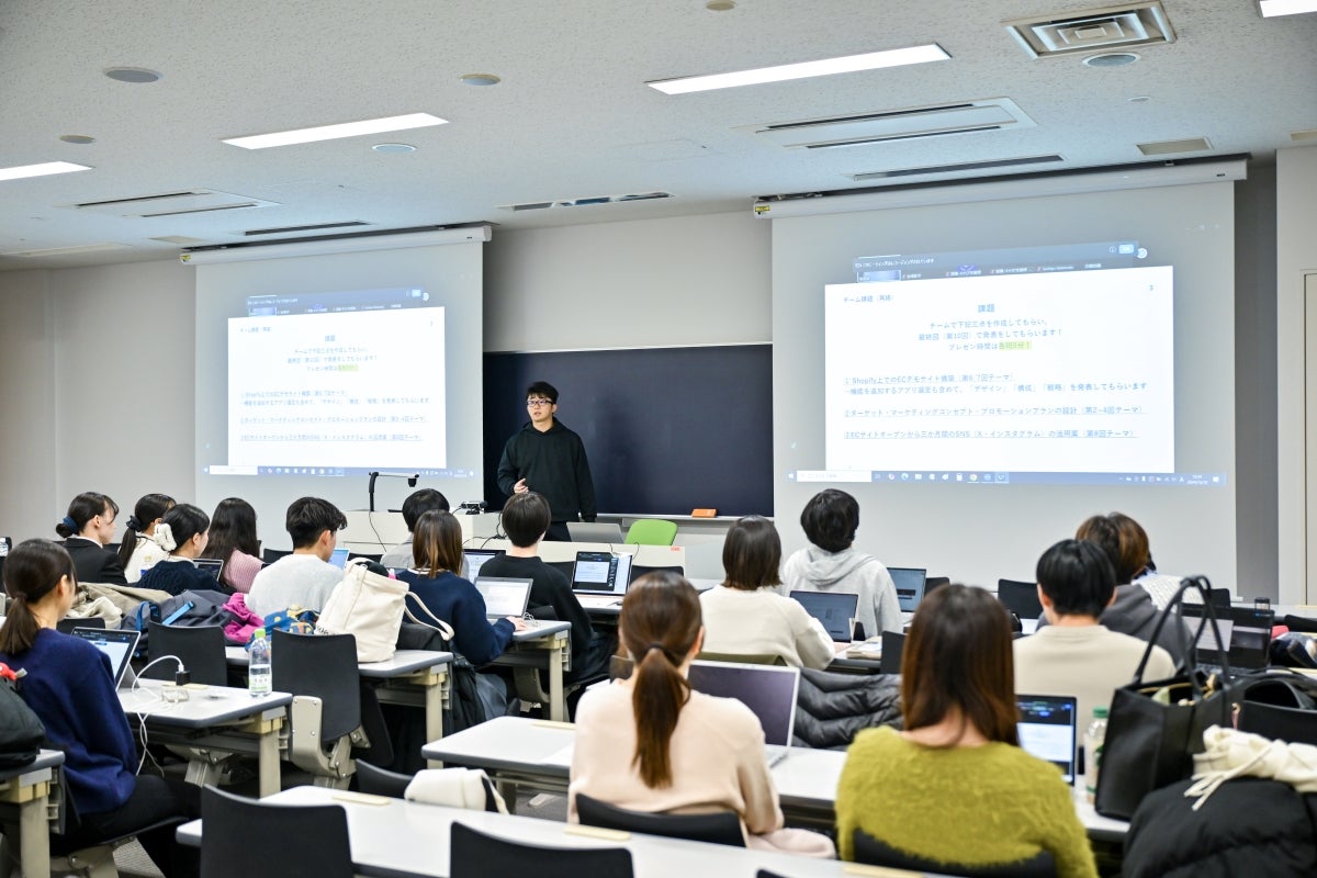 マーケティングの基礎知識や「モノ」の売り買いの基本的な考え方、ECサイトの基礎知識から制作スキルまで全10回で学び、最終回では学生たちが実際の企業をモデルにECサイトを構築、マーケティング戦略の設計と併せてプレゼンテーションを行う実践型の講座として実施されました。