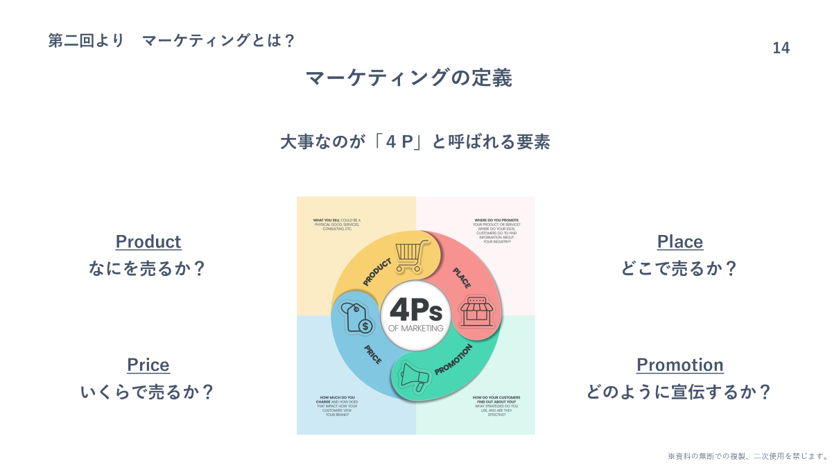 全十回の講座のうち、前半の五回を使い、「マーケティングの基本」「コマース」「プロモーション」「顧客とのつながりの設計」といった中身の基礎講義を行いました。学生にとってなかなかなじみのないマーケティングについて、実際のサービスや事例を取り上げつつ、個人ワークやディスカッションを交えたかたちで進行。実際に自分が生活の中で買っている標品、使っているサービスを題材に、基本的なマーケティングの知識と活用の仕方、さらにはモノの販売戦略の実際の作り方を学びました。