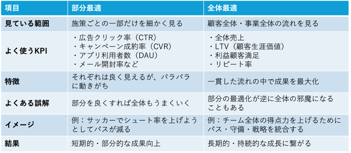 近年のマーケティング現場では、個々の施策単位でのKPIは日々モニタリングできる環境が整いつつあり、広告のクリック率(CTR)、コンバージョン率(CVR)、アプリのアクティブユーザー数(DAU)など、多くの指標はダッシュボード上で即時に可視化できます。しかし、それらはあくまで部分最適の指標にすぎず、個々の施策が"その指標"にどれだけ寄与したかは測れても、全体としての事業成長や収益貢献までを正確に捉えているわけではありません。たとえば、短期の獲得効率を優先して施策を最適化すればするほど、獲得ユーザーのLTVが下がり、中長期的には収益貢献が減少するケースは少なくありません。個別KPIが好調でも、決算説明会では売上停滞の要因説明に苦しむ――こうしたシーンは決して珍しくありません。