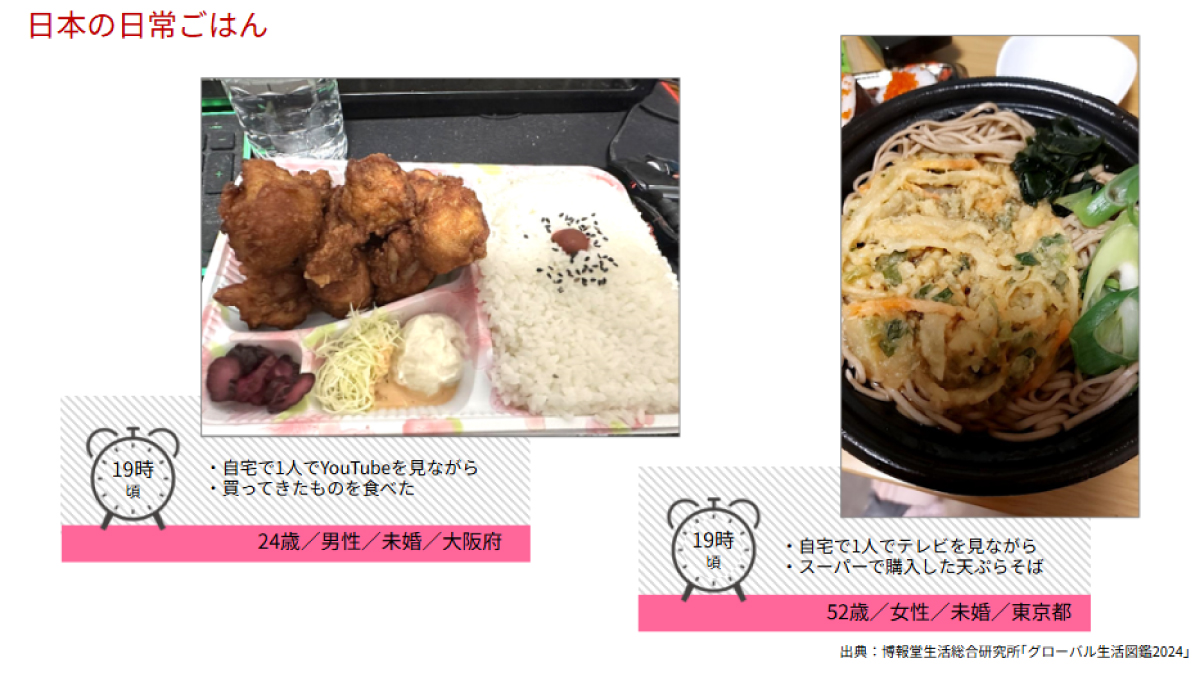 それぞれの写真に添えられたコメントを分析してみると、他の国にくらべて日本は「買う」というキーワードが多く、「ひとり」という言葉が多かったのも特徴的でした。ひとりで食べるなら作るのは面倒だし、調理済み食品を買った方がよいということなんでしょうね。
