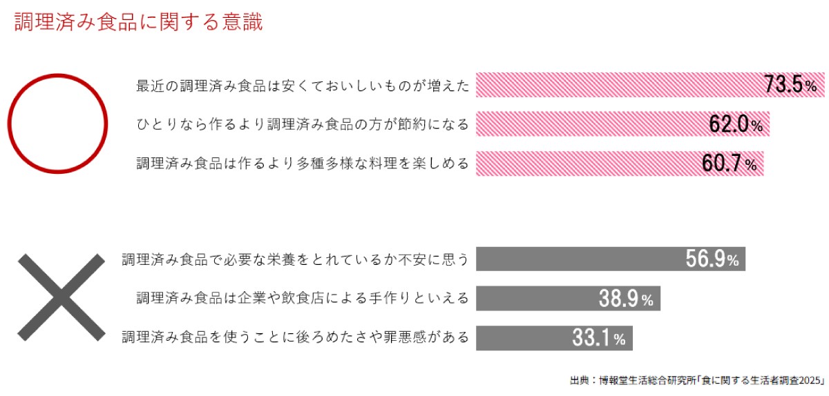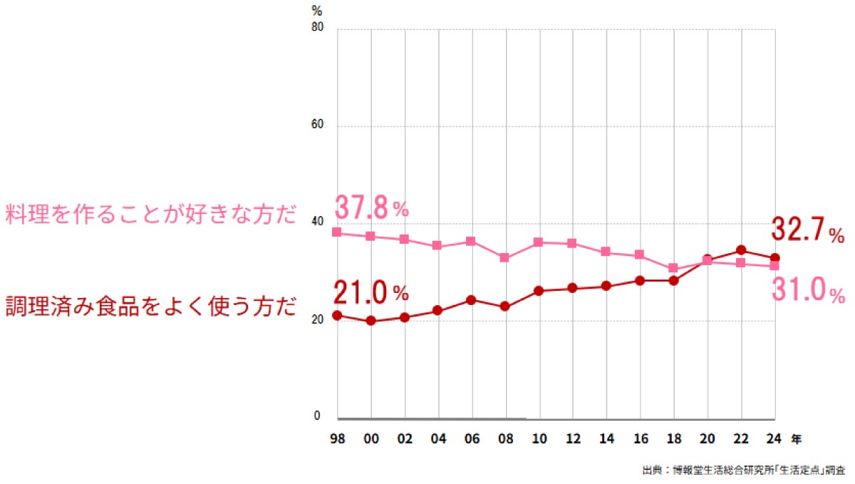 料理を作るのは大変だという理解も広がったのかもしれませんし、調理済み食品に対する意識が変化したとも考えられます。調査でも「最近の調理済み食品は安くておいしいものが増えた」「ひとりなら作るより調理済み食品の方が節約になる」といったスコアが高くなっています。